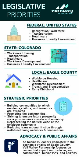 At Vail Valley Partnership, we advocate for policies that support the growth and sustainability of our region’s businesses. Our focus includes workforce housing, transportation, workforce development, infrastructure, healthcare, and the regulatory environment—all critical to a thriving business environment. We work closely with local, regional, state, and federal leaders to ensure the Vail Valley’s voice is heard in critical legislative discussions.